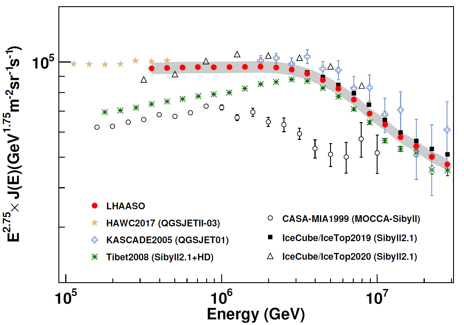 1:宇宙线全粒子能谱的"",红色点为LHAASO实验高精度测量结果。