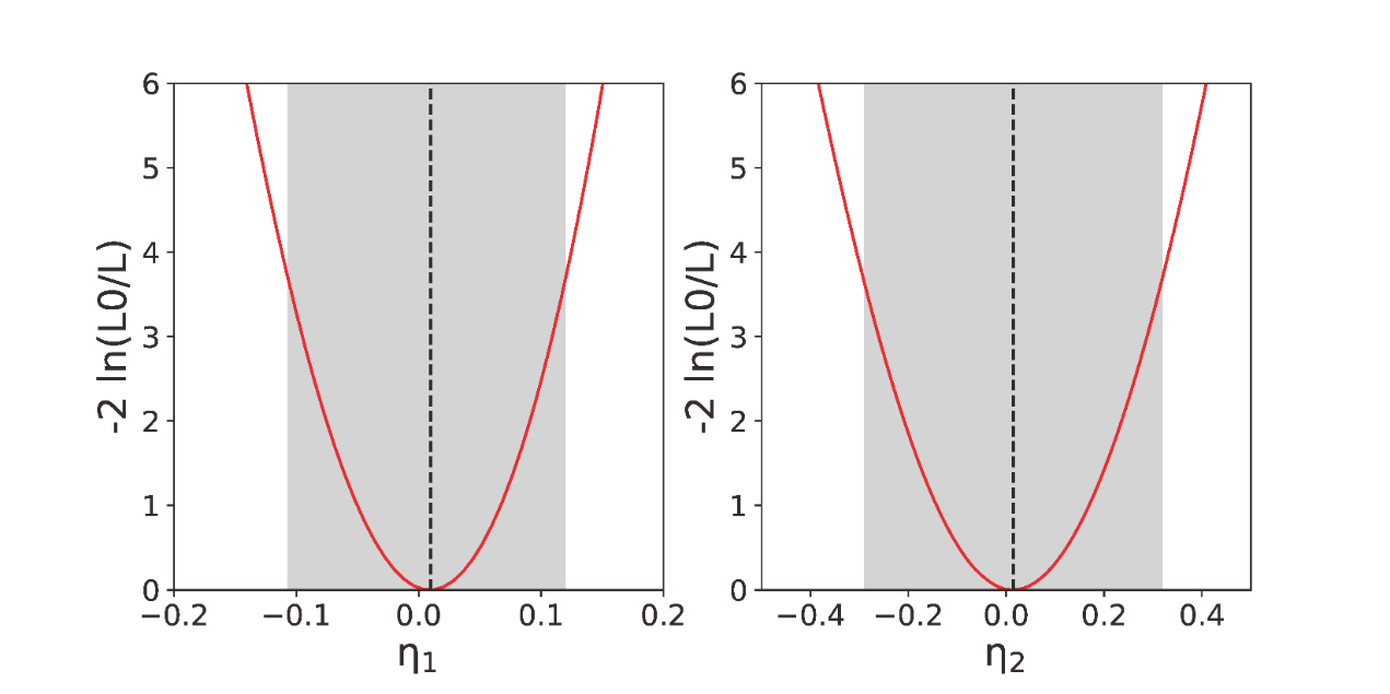 图2:LHAASO给出的量子引力能标参数h1、h2的95%置信区间。h1阴影范围对应于一阶量子引力能标下限1.1´1020 GeV(超光速情景)与1.0´1020 GeV(亚光速情景);h2阴影范围对应于二阶量子引力能标下限7.1´1011 GeV(超光速情景)与6.9´1011 GeV(亚光速情景)。