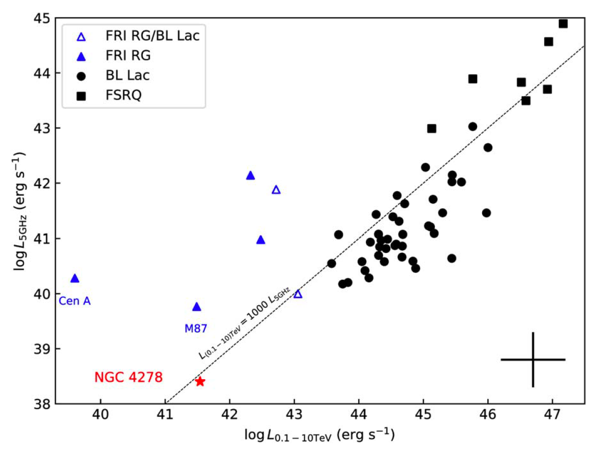 1 NGC4278(红星所示,并用红字标出)和其他类型具有甚高能伽马辐射的AGN之间的比较。图中横轴表示的是AGN的甚高能伽马射线的辐射强度量级,纵轴表示的是其射电的辐射强度量级。
