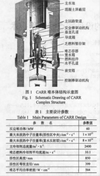 注量率水平还是研究堆的品质因子看,在国际上处于前7名位置。亚洲的主要研究堆中,CARR的中子注量水平是最高的。CARR采用紧缩堆芯反中子阱型核设计概念和使用UxSix-Al弥散型新型燃料元件, 最后选定堆型为稍加压轻水冷却和慢化、重水反射的反中子阱型池内桶式结构(图l);主要设计参数见表1。