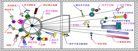 如图,高压粉末谱仪,原子能院自主设计建造的高分辨粉末谱仪,残余应力谱仪,与德国合作的织构、四圆和三轴谱仪,与中科院化学所合作的反射和小角谱仪已经建成。中子照相谱仪,与中科院物理所合作的三轴谱仪,冷中子三轴谱仪和广谱谱仪已经得到国家的项目支持,正在建设中。其他几台谱仪目前正在规划建设中。