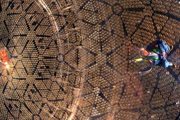 SNO探测器落成:一位技师蹲在直径12米的丙烯酸树脂容器内。这个容器的外壁如此透明,以至于我们从图上很难看到它。在他四周是10000个光电倍增器,用以探测中微子在和容器中将要注入的重水发生作用后发出的闪光。