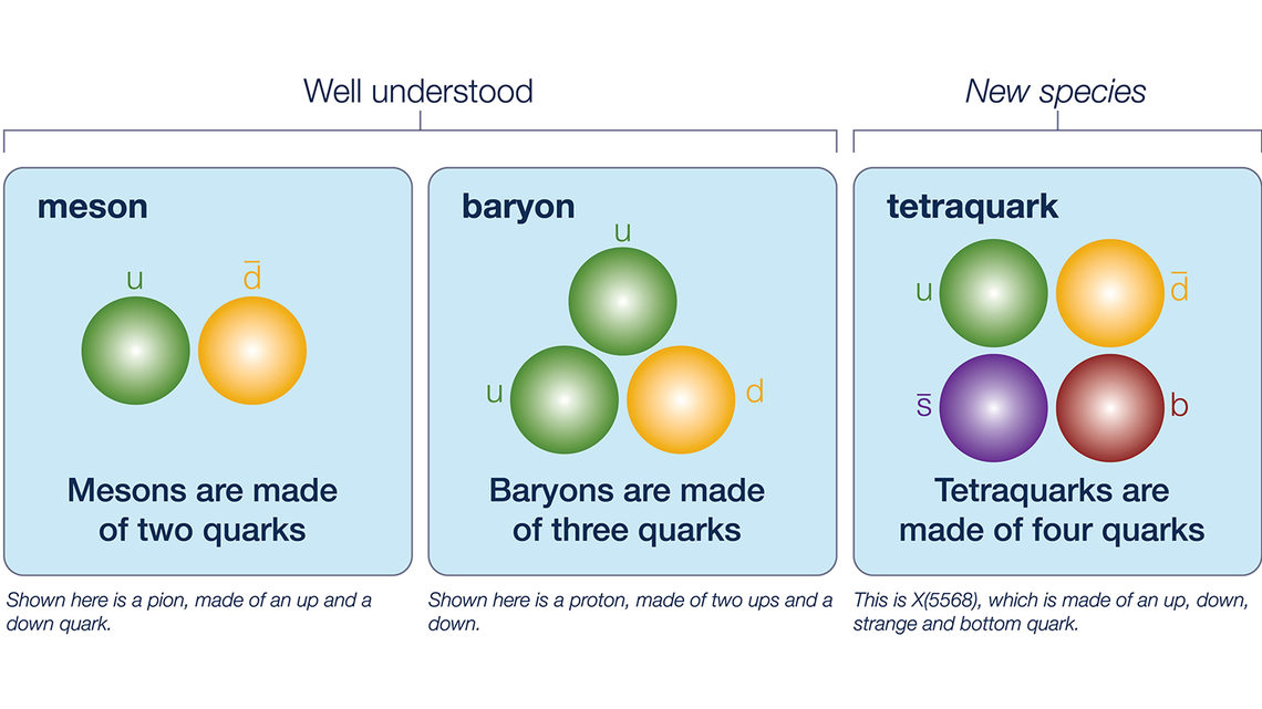 And the X(5568) is not just any new tetraquark. While all other observed tetraquarks contain at least two of the same flavor, X(5568) has four different flavors: up, down, strange and bottom.