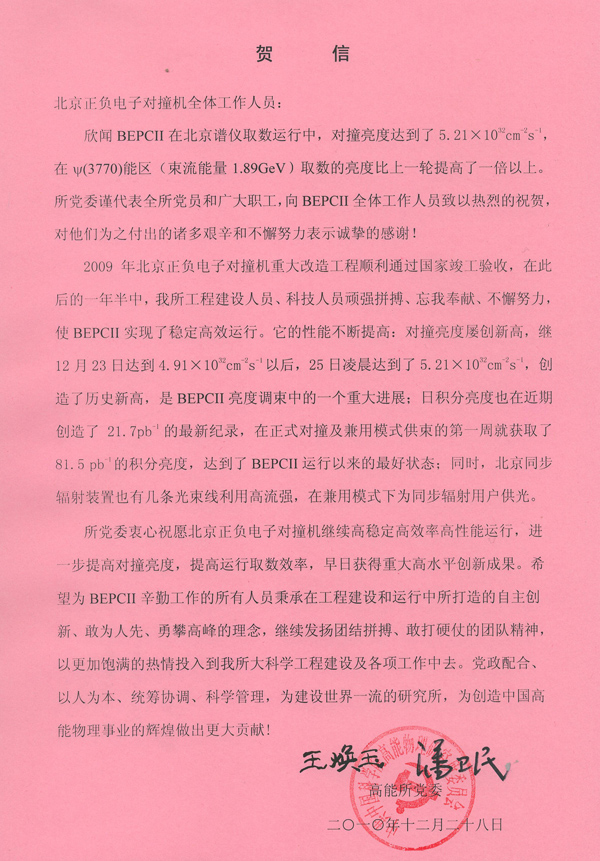 高能所党委信贺BEPCII对撞亮度达到新高