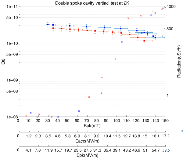 325 MHz双Spoke超导腔在2K垂直测试下加速梯度Eacc达到14.8 MV/m,对应Q0为1.16×1010,且对应峰值磁场最高达129mT,这一成果已是目前国际上双Spoke超导腔性能的最高水平。本次垂测的结果显示,在中国散裂中子源二期项目当前的初步设计方案中,双Spoke腔的设计运行梯度为7.3MV/m,并且在该梯度下Q0为2.3×1010且无明显辐射剂量,完全满足散裂二期项目的需求。