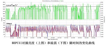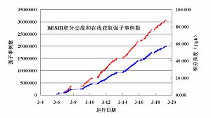 在运行中,加速器中心和实验物理中心通力合作,加速器设备稳定,对撞亮度稳步提高,峰值亮度平均在1.5×1032cm-2s-1以上,并在运行中创造了1.85×1032cm-2s-1的最高纪录;北京谱仪各子探测器高性能运行、高效率取数,日获取数据量屡创新高。截止3月19日上午8:00,BEPCII/BESIII已获取了3071万个在线强子事例,提前完成了“一个月获取超过CESRc/CLEOc的y¢数据量”的计划,取数效率比BEPC提高了15倍以上,初步分析表明,数据质量很好。