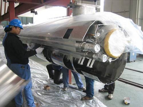 EXFEL低温恒温器的长度为12.2m,总重量为7.8吨,其中有2.8吨的冷质量和5吨的真空容器质量。鉴于其独特的结构和性能要求,加速器中心低温组科技人员在进行大量调研和充分消化吸收的基础上,将原29张图纸转换为206张适合于国内加工制造的技术图纸并分别撰写了相应的工艺和技术要求。同时根据国内外此类产品的加工经验,撰写了详细的产品制造说明书供加工单位参考使用。在加工制造阶段选派组内经验丰富的工程技术人员驻厂进行技术监督和指导工作,帮助生产方进行工艺工装的设计,确保重要部位焊接及机加工严格符合技术要求,在液氮冷激、压力、真空、漏率等重要的性能测试工作中严格把好质量关。对EXFEL恒温器最关键的漏热和支撑部件POST进行了专门研究,针对POST的特殊结构自行设计了拉力试验机对其分层进行不同等级的拉力试验。在整个EXFEL恒温器样机的研制过程中,从材料的采购、零部件的加工制造、性能测试到最后的包装运输每个步骤均进行严格的质量控制,精益求精。样机出厂时邀请了有经验的专家意大利INFN的Carlo. Pagani教授和使用方德国DESY MKS1组 Kay. Jensch参加了出厂测试和预验收,他们对样机制造过程中的工艺方法和质量控制给予高度评价。Carlo. Pagani教授认为此台低温恒温器的制造水准已经超过了对样机的要求,Kay. Jensch则表示中国的研制能力给其留下深刻印象,不会怀疑中国在以后批量生产的技术水平和能力。