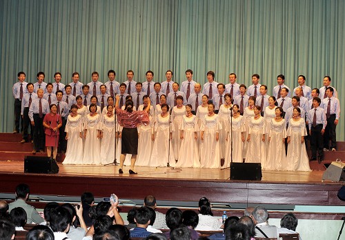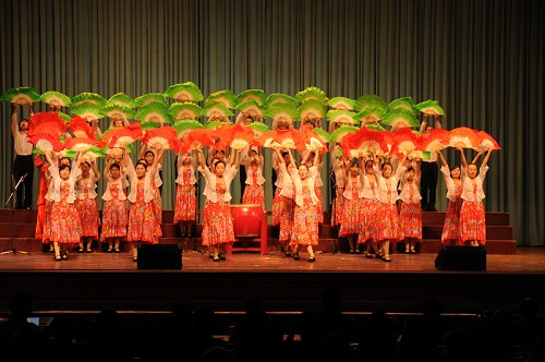 随后,由王湘鉴、张敏、江亚欧、朱威四位同志担任主持的文艺演出正式开始。工厂的大合唱《中国中国鲜红的太阳永不落》《咱们工人有力量》为演出拉开了帷幕,继而各单位选派的节目相继登场。今年的文化广场紧扣“庆祝建国60周年”这一主题,歌唱祖国、祝福祖国的节目占据主导地位,形式以大合唱、联唱、集体舞、朗诵为主,充分体现了全所上下迎接祖国母亲六十华诞的喜悦、激动心情。多位所领导、处室领导不仅高度重视,而且积极参与,甚至担任表演主力,成为演出中的一抹抹亮色。各单位参与热情高涨,精心组织、全情投入,节目内容在紧扣国庆主题的同时,创新表演方式,花样翻新,异彩连连,既有绚烂多姿的歌舞联唱,又有大气磅礴的集体舞蹈,既有学生原创的诗歌朗诵,有童声领唱的惊喜亮点, 又有离退休老同志激情澎湃的的大合唱和精彩舞蹈,还有个唱、独奏、快板等节目点缀其中,呈现出一台台精彩纷呈的视听盛宴,将演出一次次推向高潮。在各个精彩节目的带动下,现场气氛十分热烈,观众时而为嘹亮高亢的大合唱击掌伴奏,时而为集体舞的精湛技艺发出阵阵喝彩,时而沉浸在感恩温情的诗歌朗诵和柔和动人的歌声、琴声中,时而对节目表现出的积极向上的良好风貌赞叹连连,不仅观赏了一场多姿多彩的文艺演出,而且共同在高能所大集体中经历了一次深刻而生动的爱国主义洗礼。本次文化广场还有一个独具匠心的设计,那就是在观众席的左、右前方各悬挂了两幅大型投影幕布,演出前滚动播出了喜迎国庆、中秋佳节的幻灯片,提前预热了节日气氛,演出中与主持人报幕同步展示节目名称、参演单位、表演者等,并在高能所集体舞《辉煌的对撞机工程》表演中同步播放了相关图片和视频,使得观众既可以对节目进程一目了然,又能够享受到双重的感染力和震撼力。