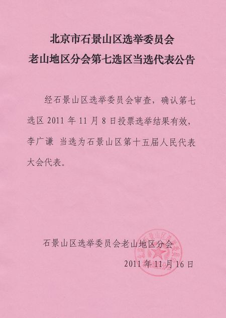 日前,石景山区选举委员会老山地区分会发出第七选区当选代表公告:经石景山区选举委员会审查,确认第七选区2011年11月8日投票选举结果有效,李广谦当选为石景山区第十五届人民代表大会代表。
