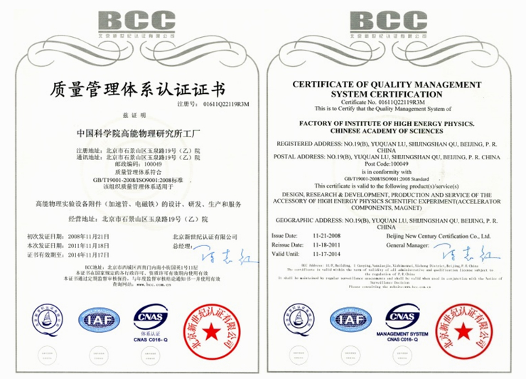 2011年11月9日至10日,北京新世纪质量体系认证中心有限公司审核组对高能所工厂质量管理体系运行情况进行外部审核。11月18日,工厂取得“质量管理体系认证证书”。