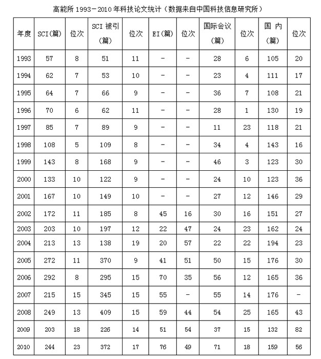 据《科学引文索引扩展版》(SCIE)数据统计:高能所2010年SCI收录论文被引用372篇,1282次,居全国研究机构第17位(2009年被引用226篇,1186次,居全国研究机构第14位),下降了3位。2001-2010年SCI收录论文累积被引用1405篇,15497次,居全国研究机构第16位(2000-2009年SCI收录论文累积被引用1092篇,10639次,居全国研究机构第16位),与上一统计年持平。高能所2010年发表SCI论文244篇,其中表现不俗的论文数为43篇,占总论文数的20.28%,高于全国平均水平,居全国研究机构第24位(2009年发表SCI论文203篇,其中表现不俗的论文数为59篇,占总论文数的29.06%,居全国研究机构第11位)。2010年度,SCI收录中国天文领域科技论文数量机构排名中,高能所荣获第6位。