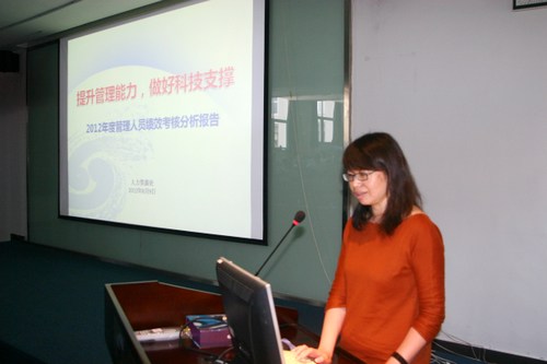 人力资源处处长郑文莉以“提升管理能力,做好科技支撑”为题,做了2012年管理人员绩效考核分析报告。报告详细描述了本次考核的总体趋势和各细项分布,探讨了存在问题及原因,提出了着力进行考核后反馈、改进提高的措施和建议。郑文莉还向与会人员介绍了提交讨论的人事文件。