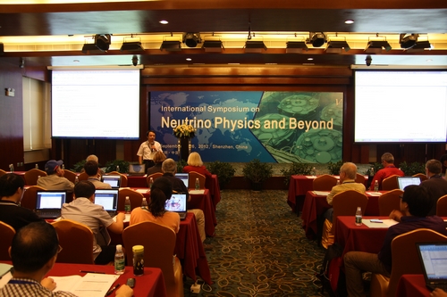 中微子及相关物理国际专题研讨会于2012年9月23-26日在深圳市成功召开。来自中国、美国、澳大利亚、加拿大、法国、德国、印度、意大利、日本、新西兰、瑞士、中国台湾、中国香港等13个国家和地区的130余位代表参加了会议。叶铭汉院士、张焕乔院士、张肇西院士、吴岳良院士等嘉宾出席了开幕式。本次会议的主席、高能所所长王贻芳及美国物理学会执行官Kate Kirby女士向大会致欢迎词。
