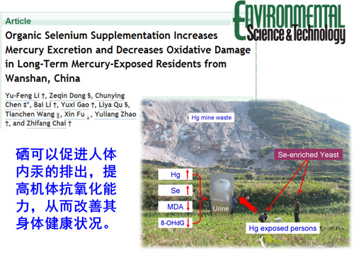 高能所多学科中心在长期汞暴露人群健康促进工作方面取得新进展,这项利用有机硒促进长期汞暴露人群体内汞排出,提高人体健康水平的成果已正式发表在环境领域一区杂志《环境科学与技术》上(Environ. Sci. Technol. 2012, 46, 11313-11318)。