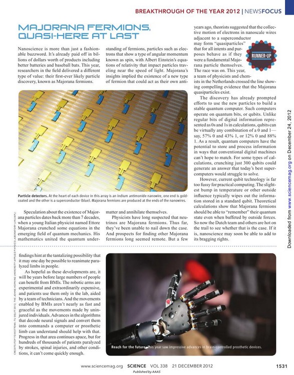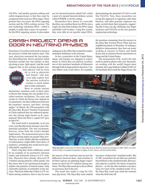 12月20日,美国《科学》杂志公布了2012年度十大科学突破,大亚湾中微子实验发现中微子第三种振荡模式的成果上榜。《科学》指出,“数百名在中国大亚湾反应堆中微子实验中工作的研究人员报告了一个模型的最后的未知参数,该模型描述了被称作中微子的这种难以捉摸的粒子在以接近光速穿行时,如何从一种类型(或‘味道’)变形为另一种类型。这些结果显示,中微子和反中微子可能会以不同的方式改变其味道,并提示中微子物理可能有朝一日帮助研究人员解释为什么宇宙含有如此多的物质及如此少的反物质。如果物理学家无法发现超越希格斯玻色子的新粒子,那么中微子物理可能会代表粒子物理学的未来。大亚湾实验的结果可能就是标志着这一领域起飞的时刻。”