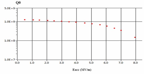 在项目组相关同志的配合下,由来自中科院上海应用物理研究所及近代物理研究所的专家组成的测试专家组对Spoke012超导腔进行了垂直测试。测试结果表明,该超导腔运行于4.2K温区时,在6MV/m的加速电场下其品质因数Q0为5.8x108,加速电场最大可以达到8MV/m以上,在最大设计加速电场7MV/m下其品质因数Q0为3.4x108,能满足ADS质子超导直线加速器注入器I对超导腔动态漏热的要求。