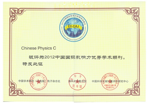 为客观反映我国学术期刊的国际影响力水平,评选单位中国科学文献计量研究中心、清华大学图书馆以Web of Science 的引文数据库为统计源,研制了《中国学术期刊国际引证报告》(CAJ-JCR)。结合期刊的国际总被引频次、国际影响因子、以及专家评议等综合指标对5025种中国学术期刊进行排序,然后按TOP 10%遴选。 《Chinese Physics C》以其在国际化方面的业绩,被评为“2012中国国际影响力优秀学术期刊”。