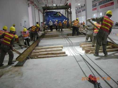 经过3天的准备工作后,从6月24日第一台板式换热器进站起到6月29日最后一台水泵到位止,本轮共有32台设备进站就位。其中3台板式换热器单台重量10吨,单台换热面积736平方米;9台冷水机组中,最大的4台单台重量达20吨,单台最大制冷量为1530冷吨;20台循环水泵中,最大的4台单台流量1152立方米/小时,扬程40米,电机额定功率160kw。冷冻站担负着散裂中子源工程主装置区工艺设备用冷及大部分辅助区空调用冷冷媒的供应,是工艺设施安装的主要项目之一。