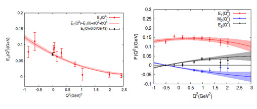 说明:以上两图给出格点QCD直接计算出的J/Ψ辐射衰变到标量胶球(左图)和张量胶球(右图)的多极形状因子随Q2的变化,利用内插得到Q2=0的值可以直接得到相应的分宽度和分支比。