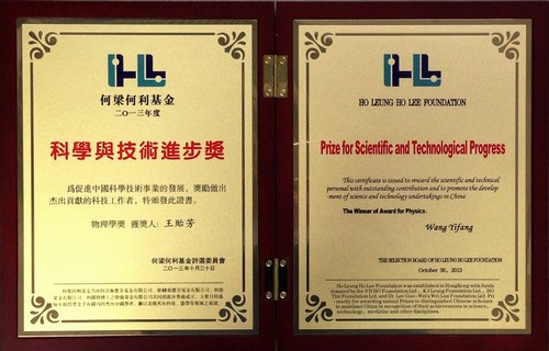 高能所所长王贻芳因在粒子物理实验方面做出了多项具有重要国际影响的贡献,荣获2013年度何梁何利“科学与技术进步奖”。王贻芳领导完成了北京正负电子对撞机上的北京谱仪(BESIII)的设计、研制、运行和物理研究,技术上达到国际先进水平并发现了一系列新粒子和新现象,在轻强子谱和粲物理方面处于国际领先地位。他开创了我国中微子实验研究,提出了大亚湾中微子实验方案并率领团队完成了实验的设计、研制、运行和物理研究,发现了一种新的中微子振荡模式。该成果入选美国《科学》杂志2012年全球十大科学突破。他提出用反应堆中微子测量质量顺序,成为我国中微子研究的发展方向。