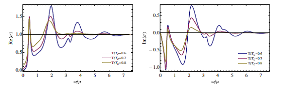说明:以上两图分别给出了不同温度下全息电荷密度波电导率的实部和虚部。实部中第一个峰代表了集体钉扎模式,第二个峰为单粒子有隙激发。其直流电导随温度降低而减小,实现了金属到绝缘体的相变。