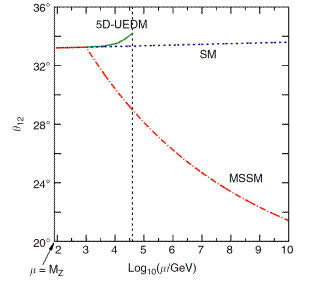 说明:上图分别显示了在5维时空的普适额外维模型(5D-UEDM)、标准电弱模型(SM)和最小超对称模型(MSSM)中轻子味混合角θ12随能标的演化行为(引自论文Nature Communications 5 (2014) 5153)。