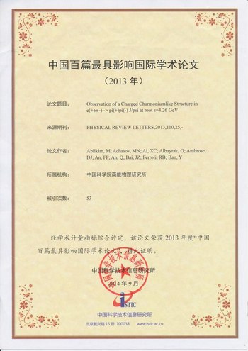 近日,中国科学技术信息研究所发布了2013年度中国科技论文统计结果研究报告。BESIII国际合作组发表的“Observation of a Charged Charmoniumlike Structure in e+e- to pi+ pi- J/psi at sqrt{s}=4.26 GeV”(Physical Review Letters 110, 252001)一文入选2013年度“中国百篇最具影响国际学术论文”。