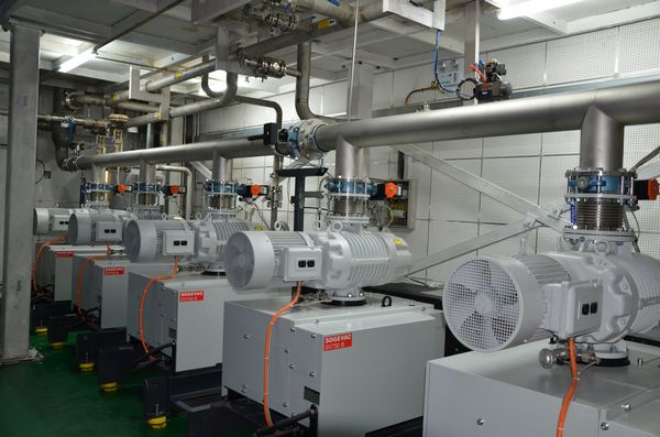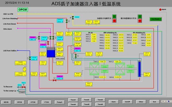 ADS注入器I 2K低温系统由高能所自主设计和研制完成,是目前国内最大的2K低温系统。主要包括4.5K低温与制冷系统和2K减压降温系统等。2K减压降温系统主要由2K低压低温换热器、2K节流阀以及减压降温泵等组成。该系统配置灵活,可以分别为运行位置和超导腔测试站(包括垂直测试站和水平测试站)的超导设备进行减压降温,也可以5组联合提供运行位置或者测试站位置进行超导腔的2K性能测试。5组泵组成的减压降温系统具有10g/s的抽气能力,最大制冷能力可达200W@2K