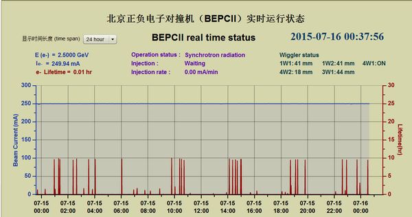 由于BEPCII直线加速器的束流为分时复用,除了给储存环供束以外,还要给试验束装置提供束流,两者不能同时进行,目前试验束装置也有很多用户在排队等候机时。716BSRF结束恒流运行,重新恢复定时注入运行方式。