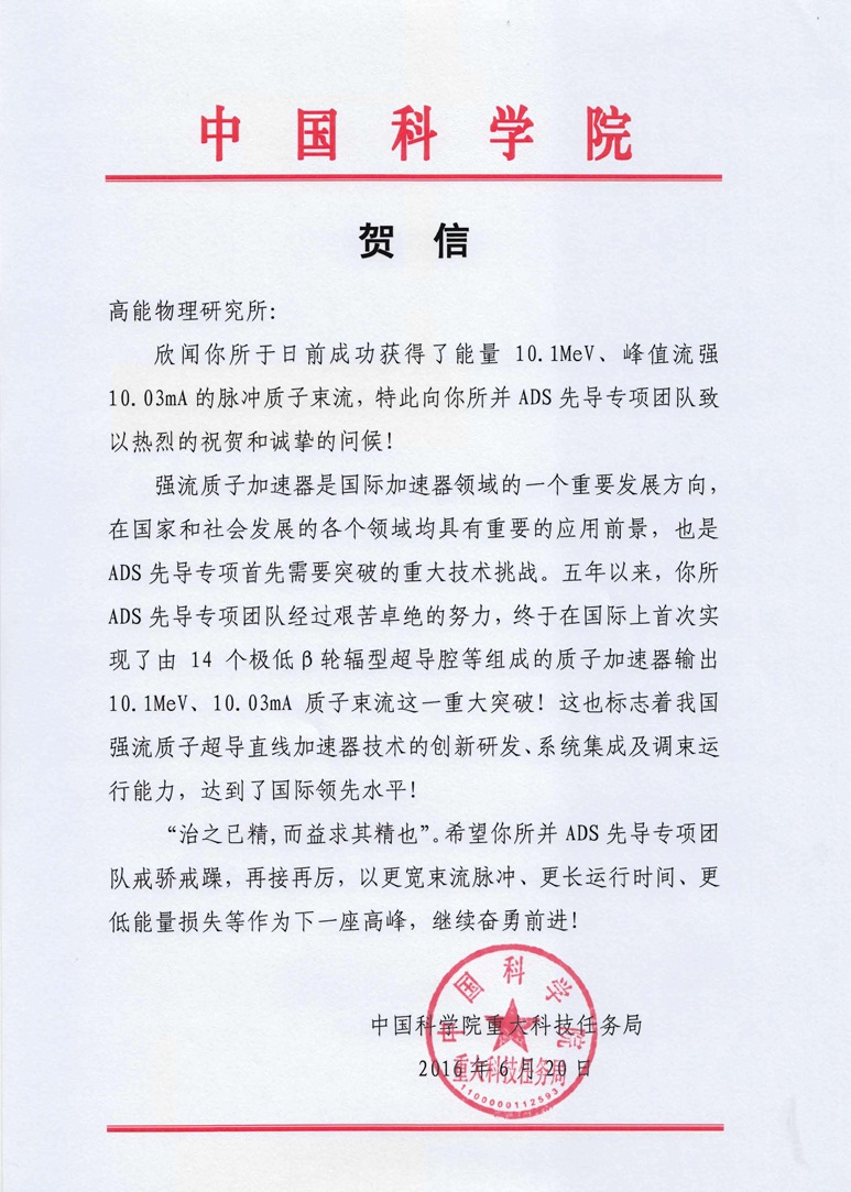 中科院重大任务局祝贺ADS强流质子加速器注入器I研究获突破