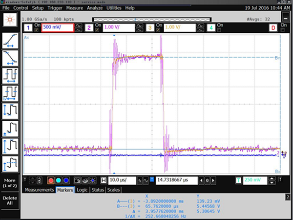 超导段入口ACCT2信号(紫色线)及超导段出口ACCT3 信号(黄色)