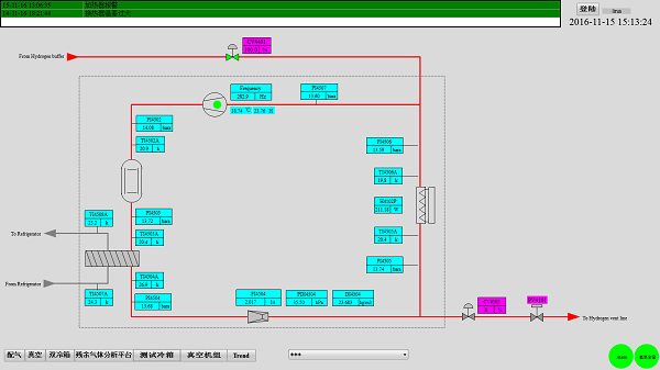 测试冷箱是低温系统自主研制的关键设备,设备在厂家完成组装后,低温系统项目组成员对其进行了液氮温区降温测试,验收合格后被运至CSNS现场。氦制冷机于2016年8月顺利完成验收测试。随即低温系统开始为首轮20 K降温调试进行准备,包括常温、低温管路的连接,控制软硬件的调试,系统的抽真空检漏,气体的净化等。由于工作量较大,项目组成员放弃节假日休息,于11月上旬完成调试的各项准备工作。