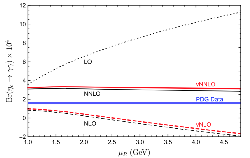 理论预言的ηc总宽度作为重整化能标μR的函数。其中LO、NLO、NNLO分别对应微扰展开领头阶、次领头阶、以及次次领头阶的理论预言。