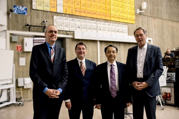 物理与天文系荣誉博士授予典礼合影(从左到右): 系主任Achim von Keudell教授、Ulrich Wiedner教授(强子物理)、荣誉博士王贻芳和校长 Axel Sch?lmerich 教授