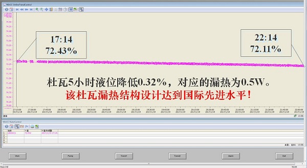 专家组听取了项目工作组的汇报,审阅了测试大纲并进行了现场测试。测试结果表明,北京大学2K垂直测试低温系统能够平稳地从4K转换到2K工作温度,并且在2K下稳定运行。在此期间,系统制冷能力为211.7W(2K下加热器电阻49.4Ω,电源电流2.07 A),大于要求的200W;氦气从垂直测试杜瓦到减压降温泵口的压力损失为2.6mbar,好于要求的5mbar,控制系统能实现自动控制要求,特别是对于一台高度5米、内容器直径750毫米的大型垂直测试液氦杜瓦,在4K下的静态漏热仅0.5W,处于国际领先水平。另外该系统在高性能低温传输技术和大温差电加热换热技术方面的研究也得到充分体现。