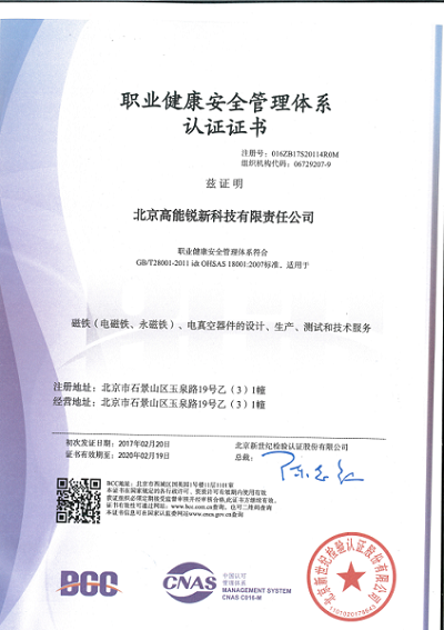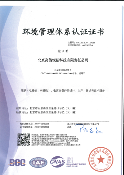 2016年12月19日至22日,北京新世纪检验认证股份有限公司审核组对北京高能锐新科技有限公司环境管理体系和职业健康安全管理体系运行情况进行外部审核。2017年2月20日,公司取得“环境管理体系认证证书”和“职业健康安全管理体系认证证书”。