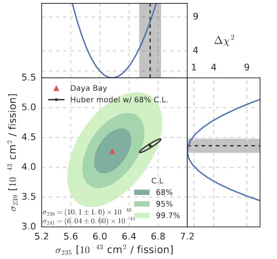 大亚湾实验四年的运行积累了超过200万个中微子事例。利用这些数据,研究了中微子数目与核燃料成份的关系,推算了各个成份的中微子产额。实验发现,核燃料中最主要的成份铀235产生的中微子数目与模型预期不一致,主流模型的预期比实际观测多了8%。同时,第二重要的成份钚239则与模型预期一致。