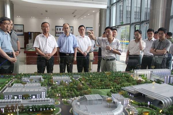 冯健身一行在CSNS沙盘前听取了奚基伟对CSNS的介绍