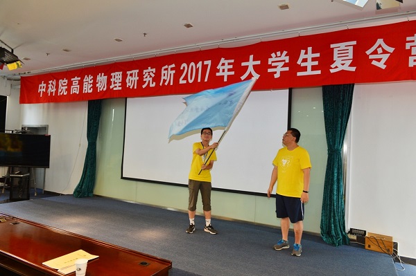 魏龙代表所领导致欢迎辞,他向参加夏令营的学子们表示热烈欢迎,并介绍了高能所内的已有的大科学装置和六月发射的“慧眼”卫星,以及未来高能所将要开展的科研项目情况。他提到:高能所依托于各种大科学装置和诸多的国际合作项目,为学生提供了一个全面、多样的科研平台,高能所的学生会有去国际知名大学和机构学习、工作的机会,这些优势对学生今后的科研工作益处良多;他还说,高能所浓厚的学术氛围、多学科交叉的科研特点以及非常自由的学术环境可以使学生有机会实现自己的科研想法,因此他鼓励同学们能在夏令营中多与所内的导师以及师兄师姐交流,以更好地了解高能所。随后,魏龙将夏令营营旗授予营员代表叶培然,夏令营正式开始。