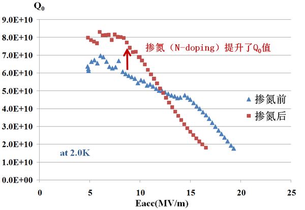 与掺氮前相比,这只超导腔(编号:650S1)低场下(5~10MV/m)的无载品质因数Q0值明显提高,加速梯度Eacc在10MV/m时,Q0为7.0x1010,这是国内首次观察到掺氮对该频段超导腔Q0值的提升现象。超导腔掺氮是加速器领域最近几年发展起来的新技术,可以降低超导腔的表面电阻、提高Q0值,已被美国的LCLS-II加速器所采用。