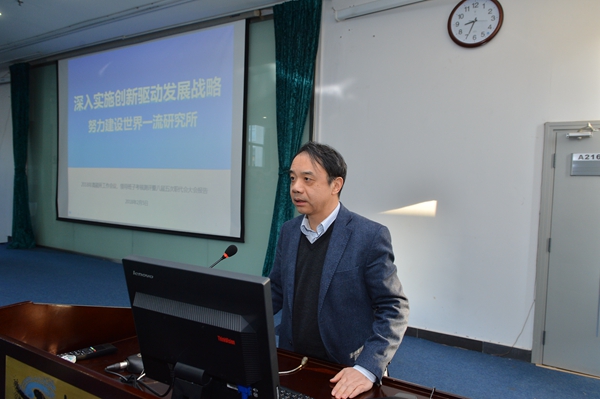 王贻芳首先介绍了国家对全面加强基础科学研究作出重要部署情况和2020年、2035年、2050年三步走发展目标,并传达了中科院2018年工作重点。他指出,2017年高能所全面实施创新驱动发展战略,深入实施中科院“率先行动”计划,秉持创新发展理念,在硬X射线调制望远镜(HXMT)、中国散裂中子源(CSNS)、ADS强流质子加速器注入器 I等大科学装置建设和运行中取得了一系列重大科研成果,七项培育重点有力推进,CEPC、HERD、eXTP等预研项目积极开展预研,推动立项,我所各管理部门锐意创新,采取有力措施,管理工作有了新的提高,在技术成果转化、人才队伍建设、创新文化建设等方面取得了丰硕成果。他同时介绍了高能同步辐射光源的建设将是我所下一步的工作重点。