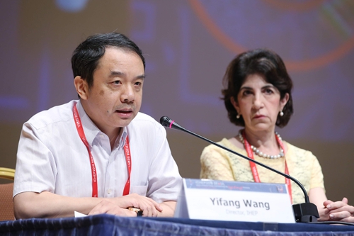 针对高能物理的未来发展规划以及国际合作,大会组织了专门的高级别讨论。高能所所长王贻芳与欧洲核子研究中心(CERN)主任、加拿大粒子和核物理国家实验室(TRIUMF)主任、日本高能加速器研究机构(KEK)所长和美国费米实验室资深代表作为嘉宾参加了讨论。