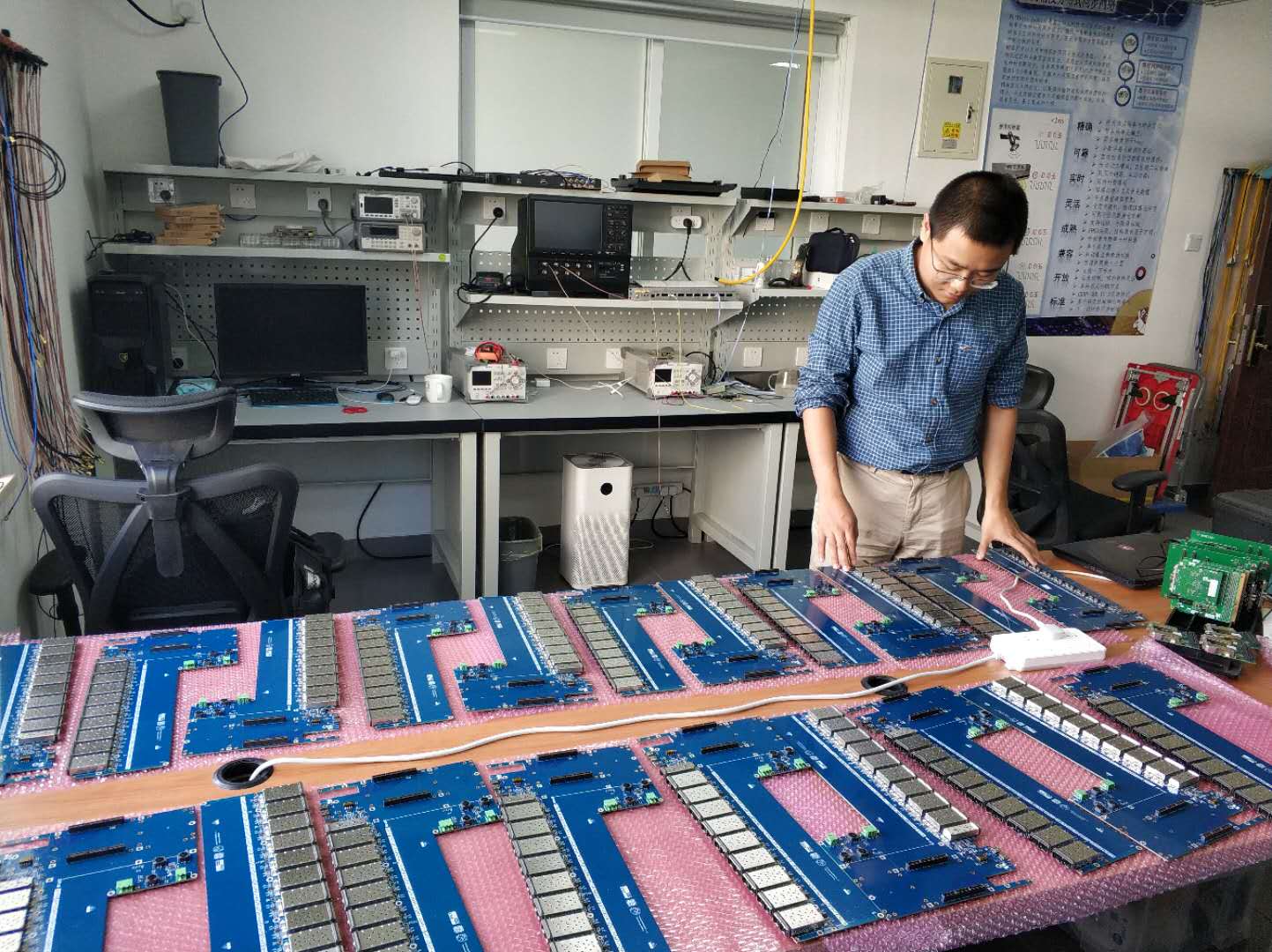 会议对设备进行了现场检验和测试,并由时钟系统承担单位(清华大学工程物理系核电子学与系统控制教研室)介绍该设备的研制过程,详细描述了其设计原理和相关测试结果。基于成熟设计的基础,项目组针对LHAASO工程的要求改进电源设计、调整电路结构和布线,降低系统功耗和设备温度,保障设备部署在野外恶劣环境时的可靠性。所研制的原型设备经过多单位的全面试用和比对测试,系统性能指标先进,工作状态稳定可靠。项目组实现了小批量试制,搭建了批量生产测试和验证环境,确定了生产检测流程工艺。