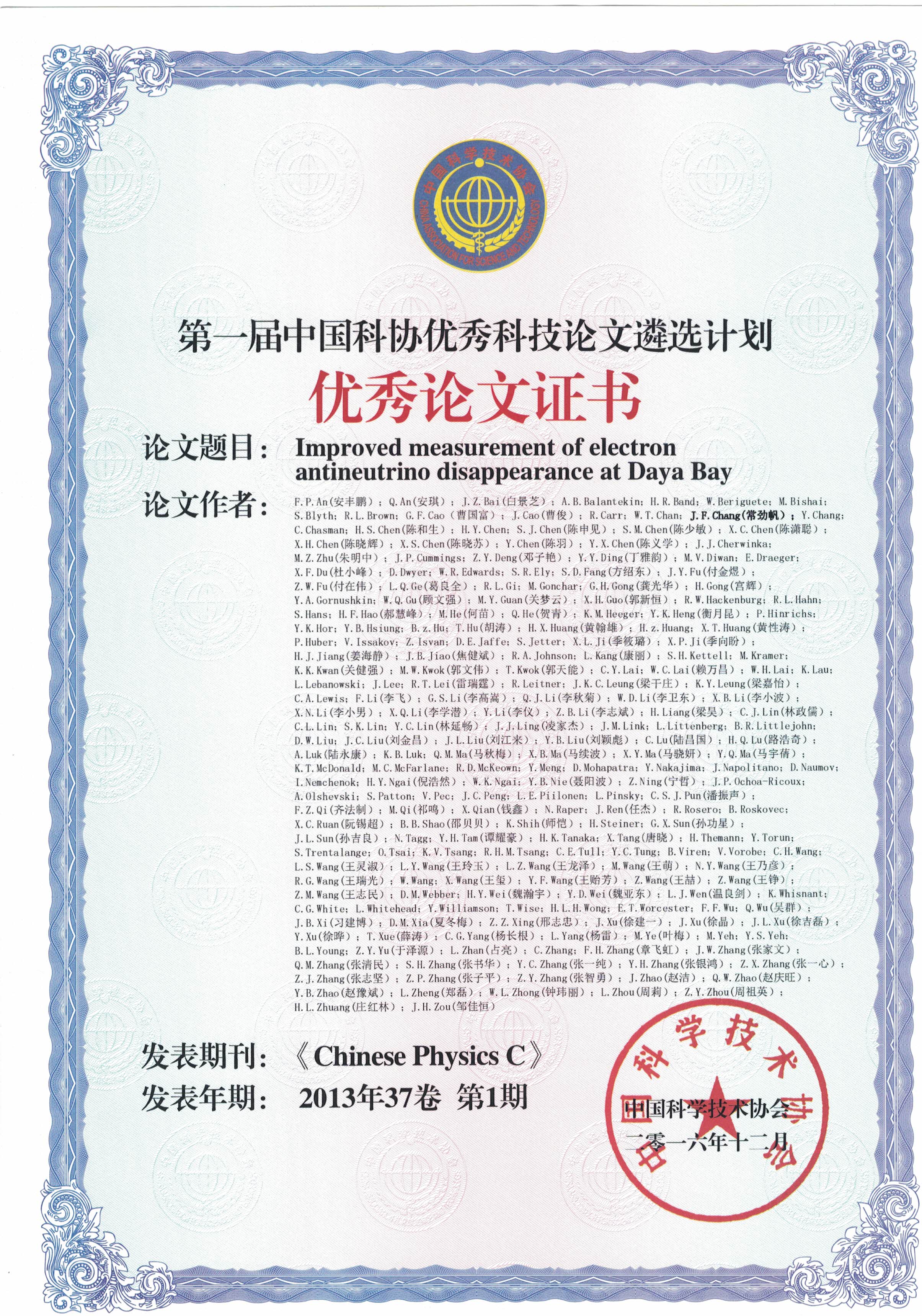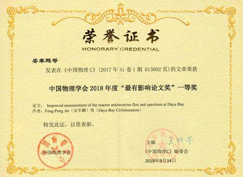 值得一提的是,这是大亚湾实验第二次获得该奖。关于中微子振荡参数测量的论文(Chinese Physics C, 2013, 37 (1): 011001)获得了中国物理学会2014年度“最有影响论文奖”一等奖,也被评为“第一届中国科协优秀科技论文遴选计划”优秀论文,迄今被引用381次(Inspires数据库)。