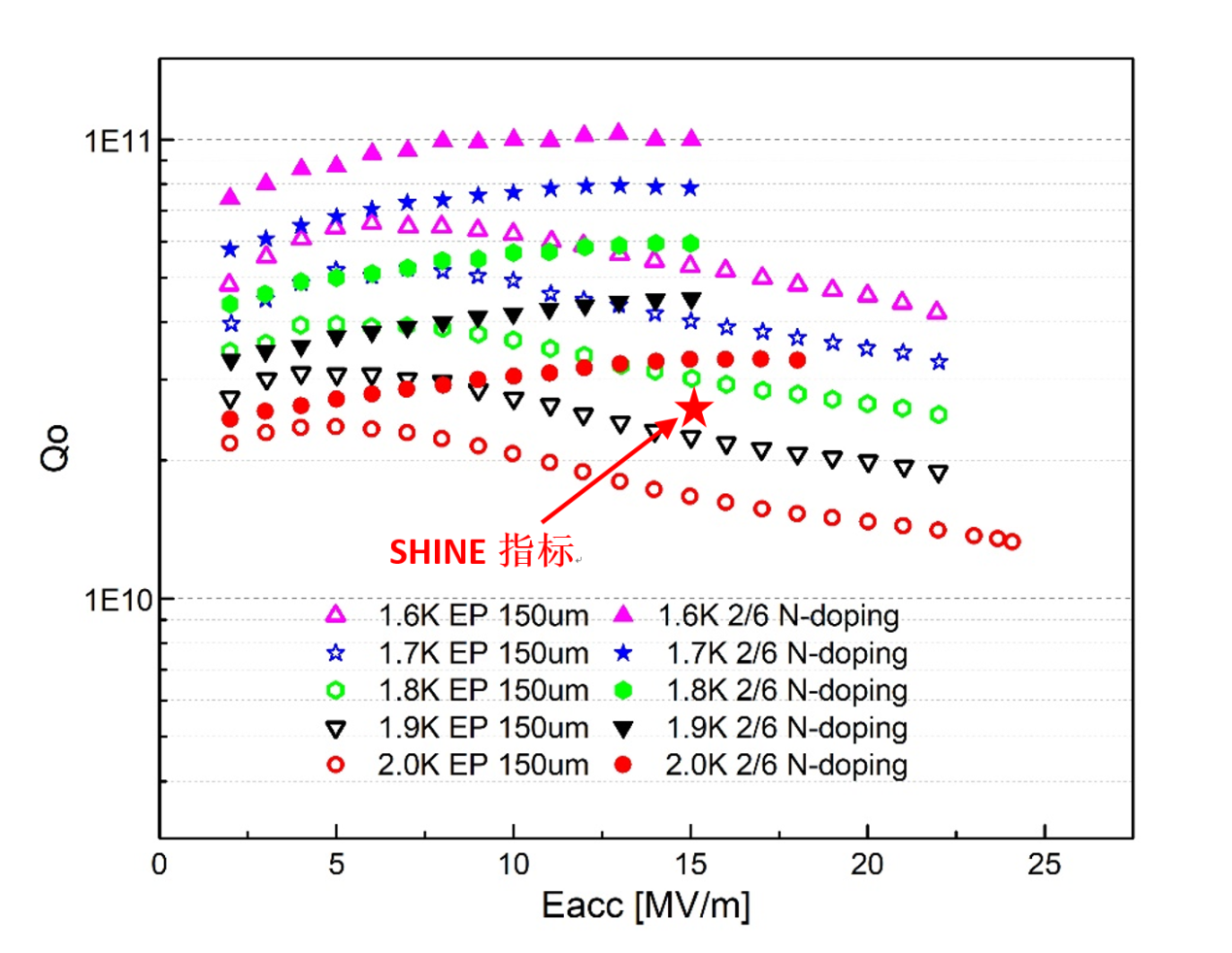 同时,对1.3GHz 1-cell超导腔进行了掺氮(N-doping)实验,垂测结果达到3.3 ×1010@18MV/m,Q值比掺氮前提高了1倍。这是国产超导腔(细晶单腔)第一次达到SHINE的设计指标(2.7×1010@16MV/m)。此外,测试过程中观察到了明显的anti-Q-slope现象,即超导腔的Q值随加速梯度Eacc的升高而变大,这是1.3GHz超导腔进行掺氮后的典型现象。