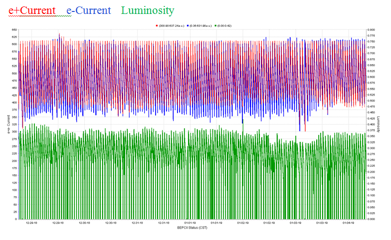 在元旦佳节,辞旧迎新之际,加速器中心运行值班人员仍坚守岗位,24小时不间断地进行束流调试工作。同时在全体运行维护人员的共同努力下,2018年12月28日18:00至2019年1月5日1:00,对撞束流峰值在600mA以上无故障稳定运行连续一周以上(175小时)。