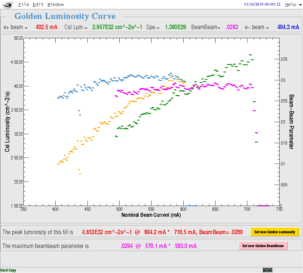 2019年1月8日加速器机器研究后,通过更改束流束团分布,进一步优化束流参数,峰值亮度,班和周积分亮度较2018年均创造了新的积分亮度纪录,其中峰值亮度最高到4.653×1032cm-2s-1,班积分亮度最高达到12.46/pb,周积分亮度到131.92/pb。