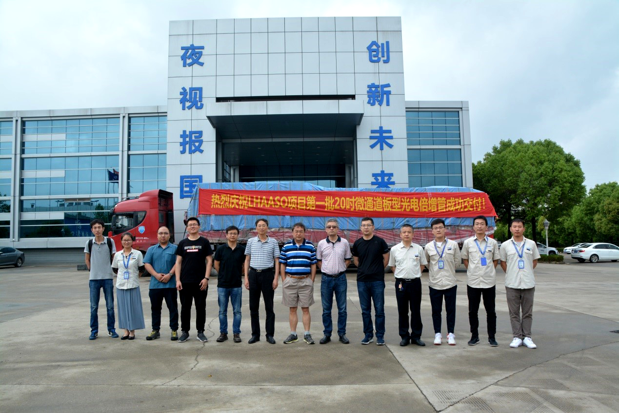 5月26日下午,用于高海拔宇宙线观测站(LHAASO)水切伦科夫探测器阵列的首批20英寸微通道板型光电倍增管通过检测并交付业主,发往四川稻城LHAASO安装现场。LHAASO项目首席科学家曹臻研究员、北方夜视技术股份有限公司总经理苏德坦及副总经理孙建宁等相关人员,共同见证此次产品的交付并对这批光电倍增管的测试程序与结果展开了深入的讨论。LHAASO项目方面对产品的质量和交付工期均表示满意。