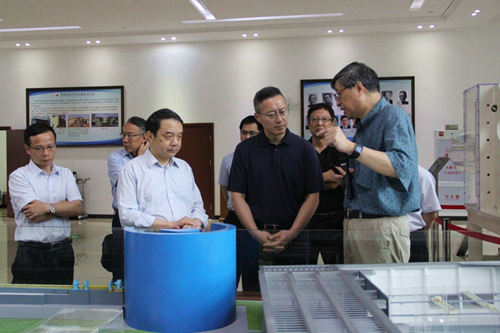 沈竹林在CSNS沙盘模型前听取了陈和生院士关于装置概况、原理和应用的介绍,并详细了解了散裂中子源与同步辐射光源等大科学装置各自的性能和特点,以及国际上同类大科学装置的发展现状与趋势。陈和生提出,希望尽快加强CSNS二期功率升级和谱仪的建设,以最大程度发挥装置效能,满足国家发展战略的迫切需求。沈竹林表示,将积极支持CSNS相关谱仪的建设。