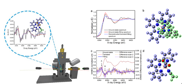 此项工作中发挥关键作用的时间分辨同步辐射X射线吸收谱(TR-XAS),是在高能所北京同步辐射装置1W2B光束线站完成。科研人员利用TR-XAS,捕捉到激光激发0.4微秒后Ni(II)催化反应中心形成还原态的Ni(I)中间体,具体过程为:一个三联吡啶配体从Ni(II)催化剂分子中脱离,中心Ni离子与CO2和CH3CN发生配位,最终形成非中心对称的几何结构。